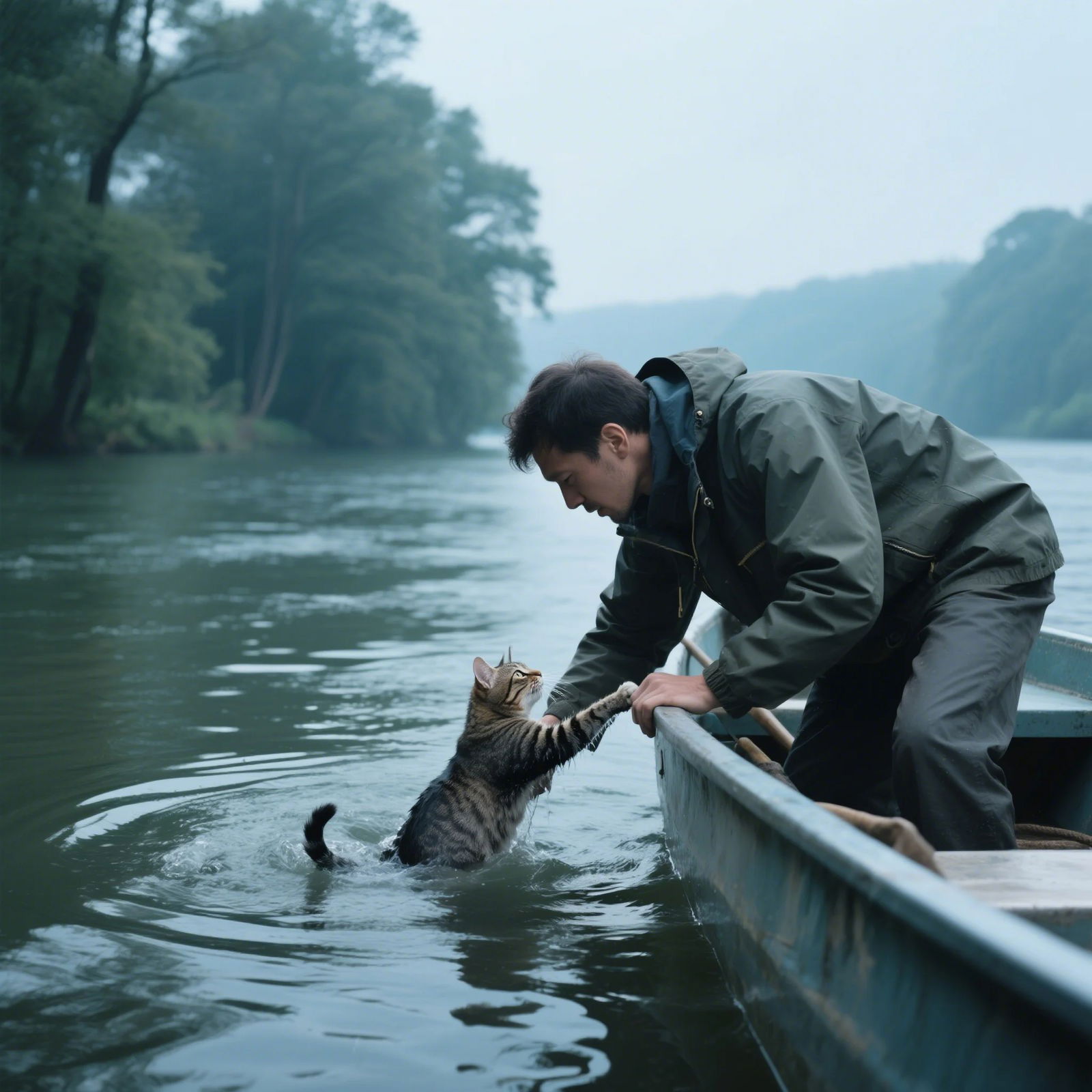 The cat let out a pitiful meow and tried to paddle toward them, but it was clearly out of strength.