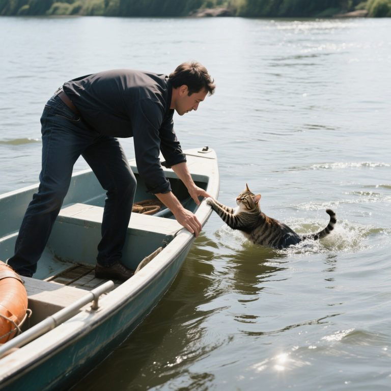 The rescue wasn’t easy — the frightened cat thrashed and scratched, darting around in panic. But eventually, they managed to scoop him up gently and lift him aboard.